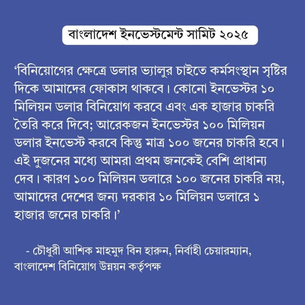 আগামী ৭-১০ এপ্রিল রাজধানীর হোটেল ইন্টারকন্টিনেন্টাল ঢাকায় বাংলাদেশ বিনিয়োগ উন্নয়ন কর্তৃপক্ষ (বিডা)’র আয়োজনে “বাংলাদেশ ইনভেস্টমেন্ট সামিট ২০২৫” অনুষ্ঠিত হবে। সামিটের মূল লক্ষ্য হচ্ছে বাংলাদেশের বিনিয়োগ সম্ভাবনা তুলে ধরা, জুলাই বিপ্লব-পরবর্তী অর্থনৈতিক সংস্কার প্রদর্শন করা এবং দীর্ঘমেয়াদী বিনিয়োগ সংযোগ তৈরি করা।